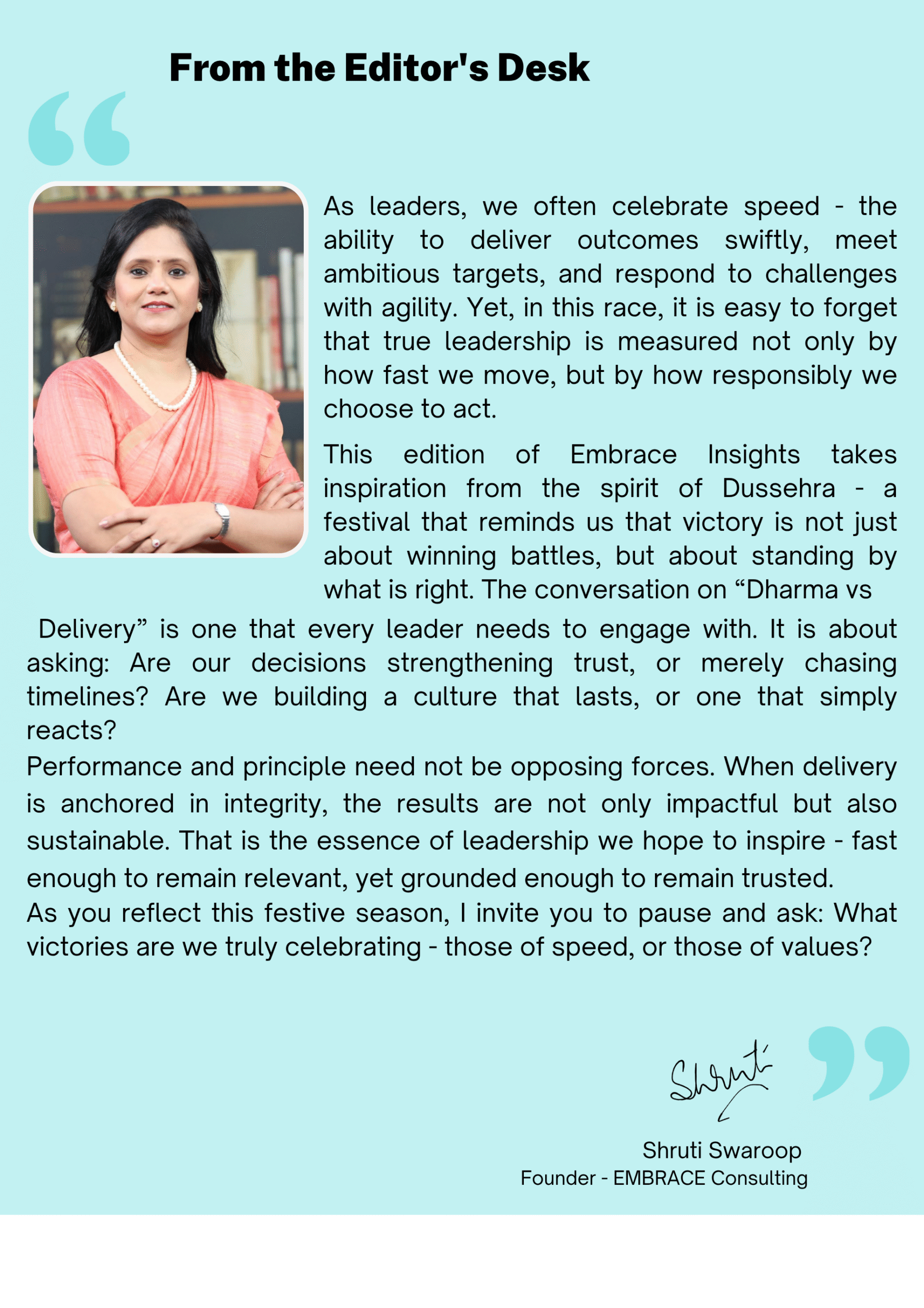 The struggle between these two forces is known to all leaders. Momentum is powered by delivery, but dharma provides purpose. Single-minded focus on one leads to imbalance: speed without values risks loss of trust, and values without speed risks non-action.